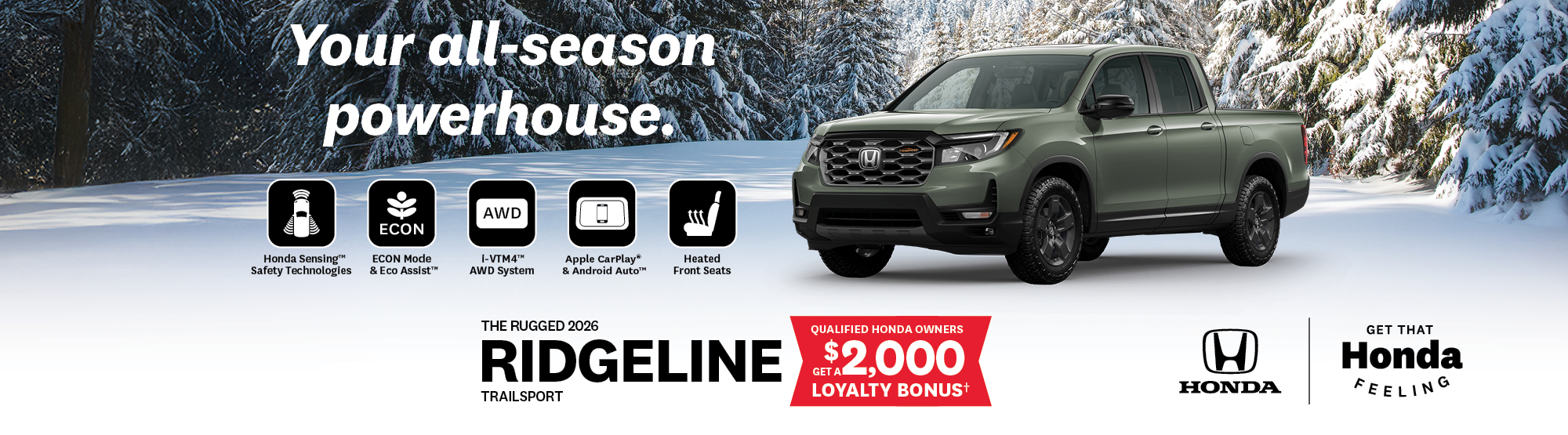 * Every reasonable effort is made to ensure the accuracy of the information listed above. Vehicle pricing, incentives, options (including standard equipment), and technical specifications listed is for the 2026 Honda Ridgeline Black Edition All-Wheel Drive Crew Cab 5.25 ft. box may not match the exact vehicle displayed. Please confirm with a sales representative the accuracy of this information.